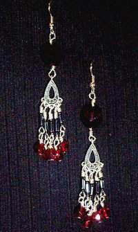 Earrings: SterlingSilver set with Marcasite stones, gun-metal Czech tube and seed beads, 12mm & 6mm Fire Polished Garnet beads. Drop 3 1/2", French Wires..