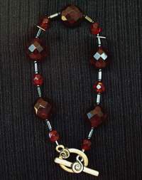 Bracelet: Gun-metal Czech tube and seed beads, 12mm & 6mm Fire Polished Garnet beads. Length 7 1/2", fancy toggle closure is the same as on the necklace.