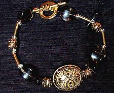 This set just looked to me like something one might buy in a street bazaar in Morocco, thus the name. The neckpiece was a real find (3" wide by 2 1/2 long), and I embellished it by adding yellow Swarovski Crystals and a 6x4mm oval Peridot. The necklace is a convertible, held together by magnets, and can be worn together or single. The beads are an olive green Czeck glass. The focal bead on the inner necklace is 22x18mm. The lengths, 20", and 18". Earrings, 2 1/4" drop, bracelet 7" with toggle closure. This is a very showy piece.