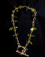 Bracelet: Peridot chip chain with fancy silvertone toggle closure. length 7 1/2".